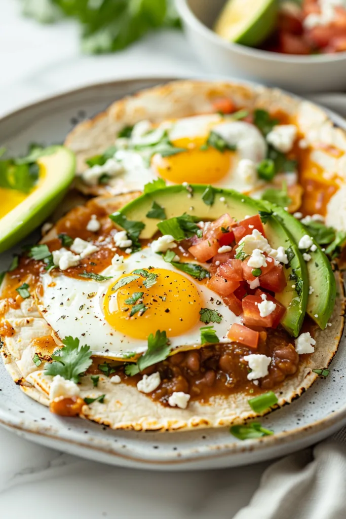 This dish is packed with protein from the eggs, healthy fats from the avocado, and fiber from the beans and corn tortillas. A typical serving contains approximately 311-520 calories depending on portion size and toppings, making it a balanced and nutritious brunch option.