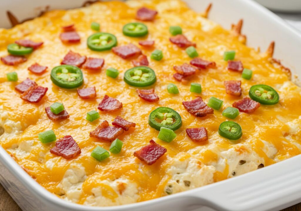 - Sprinkle the diced jalapenos, crumbled bacon, and shredded cheddar cheese evenly over the cream cheese layer.