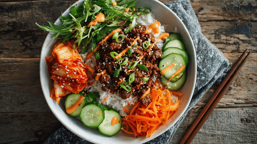 The magic of this Korean Beef Rice Bowl lies in its perfect balance of flavors and textures. The sweet-savory sauce clings beautifully to the ground beef, while the fresh vegetables provide crucial crunch. The kimchi adds tangy, fermented complexity, and the gochujang mayo ties everything together with creamy heat.