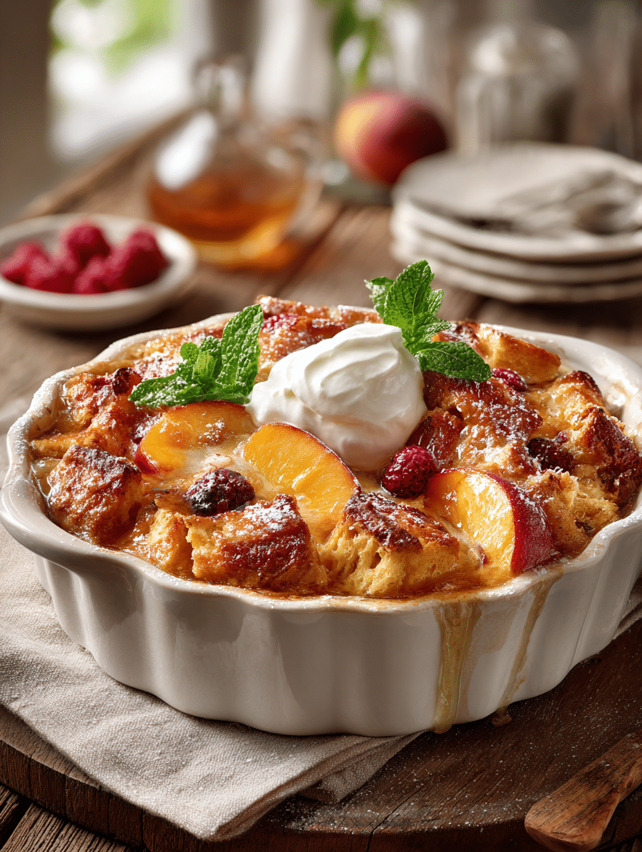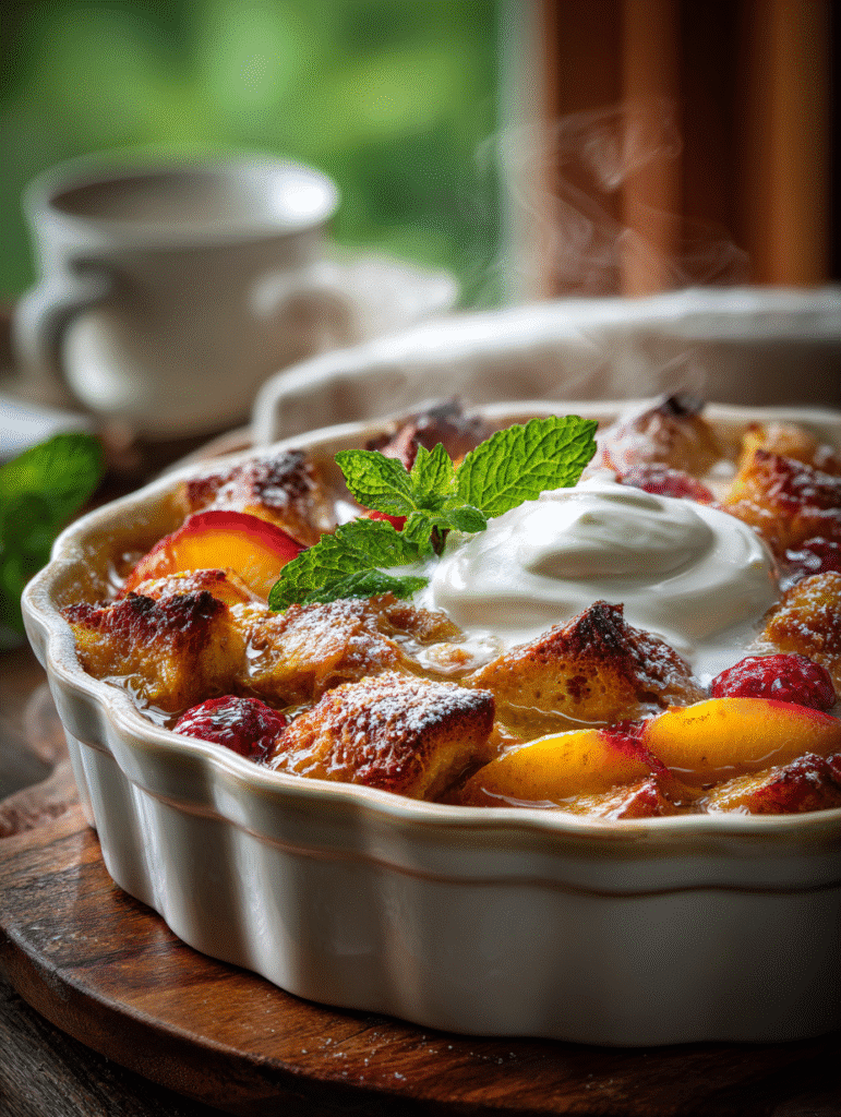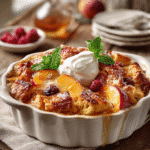 This Late-Summer Bread Pudding with Fresh Fruit combines buttery croissants, ripe stone fruits, and a rich cinnamon-spiced custard for an incredibly moist and elegant dessert. Perfect for using seasonal fruits and day-old bread, this recipe delivers restaurant-quality results that rival the best banana bread. Serve warm with whipped cream or ice cream for the ultimate comfort dessert.