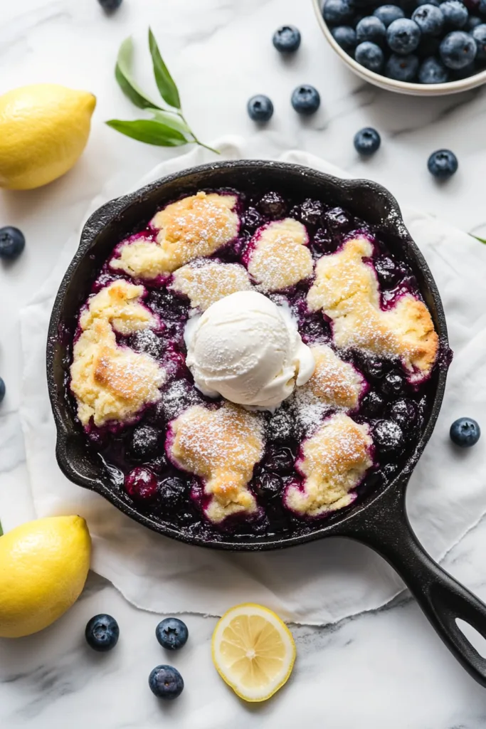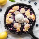This easy Lemon Blueberry Cobbler bakes up golden and bubbly in a cast-iron skillet with fresh blueberries, bright lemon zest, and a buttery buttermilk batter. A perfect spring dessert served warm with vanilla ice cream or whipped cream.