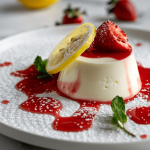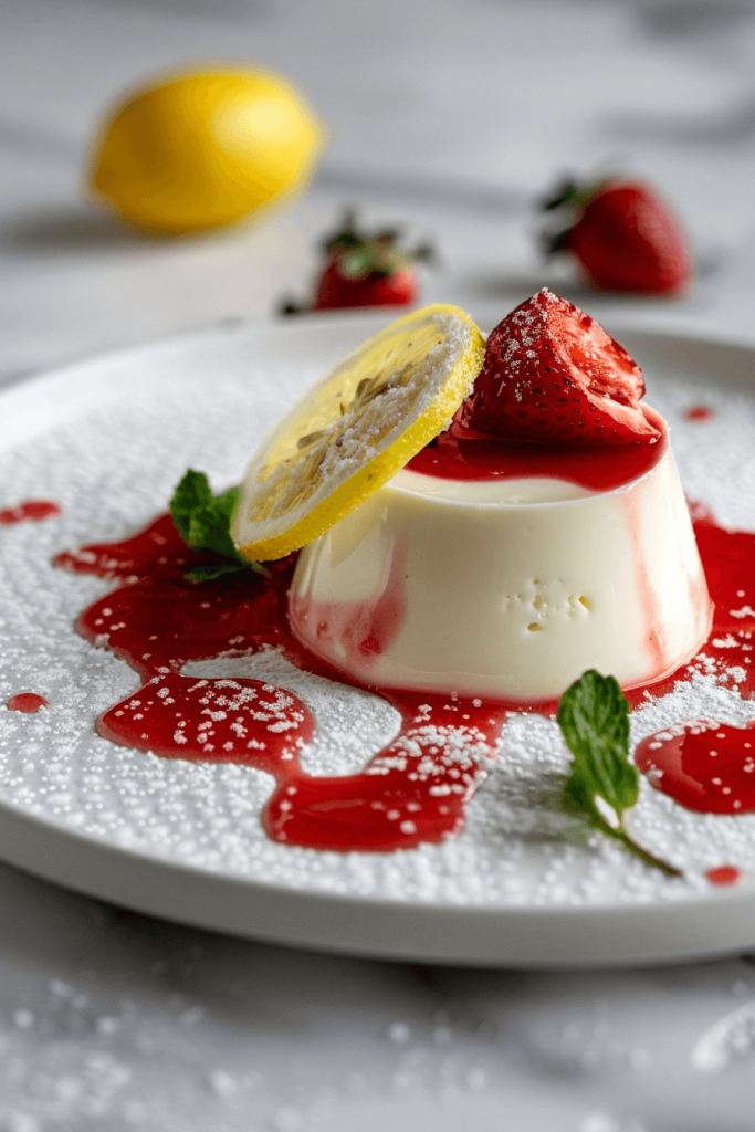 Creamy Limoncello Panna Cotta topped with fresh strawberry sauce. Elegant Italian dessert perfect for dinner parties.