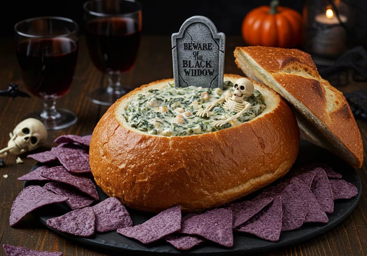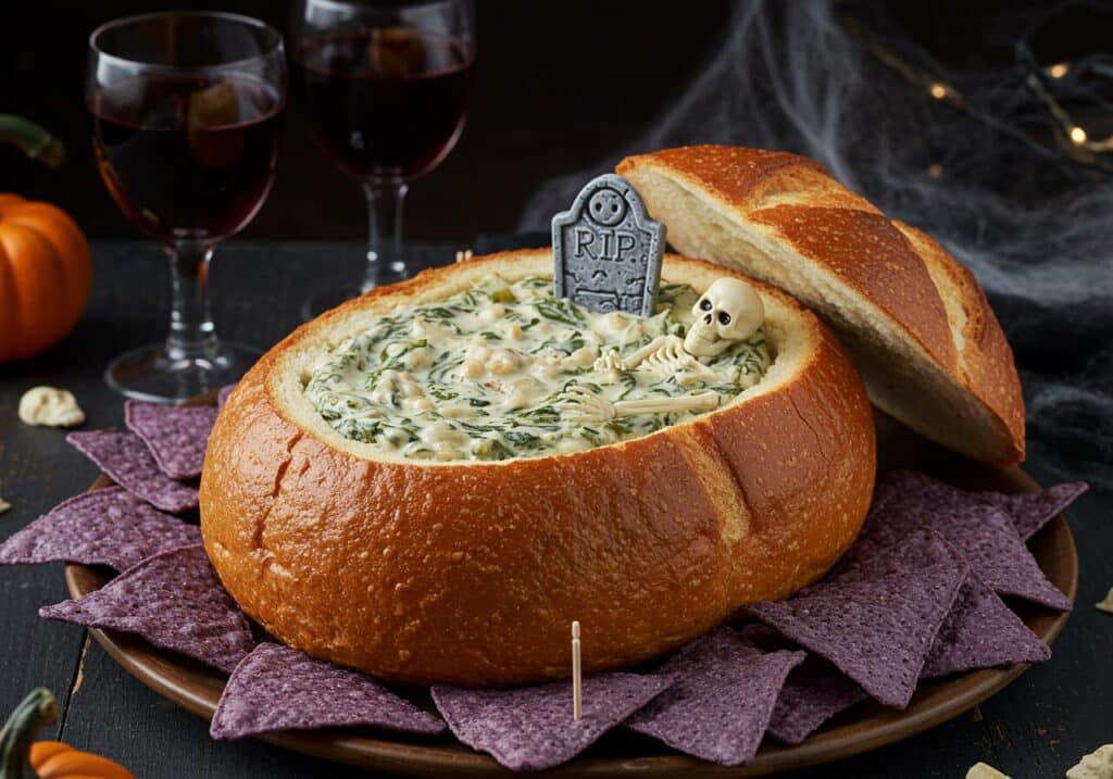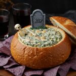 6. Fill and garnish: Scoop the chilled spinach dip into the bread bowl “coffin.” For a Halloween twist, nestle a decorative skeleton inside and prop open the lid with wooden skewers.