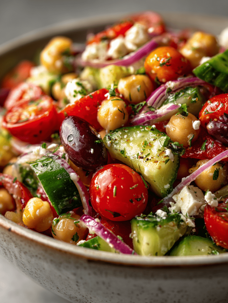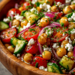 Mediterranean Chickpea Salad is one of those recipes you’ll keep coming back to when you want something fresh, colorful, and incredibly easy. It’s packed with fiber-rich chickpeas, crunchy vegetables, and creamy feta, all tied together with a bright lemon vinaigrette that makes every bite feel light yet satisfying. This is the kind of dish that works as a healthy lunch, a simple dinner, or a vibrant side for grilled meats or seafood.