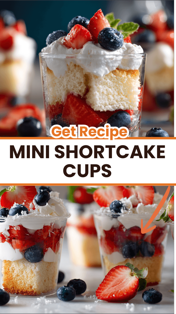 These adorable Mini Strawberry Shortcake Cups layer fluffy angel food cake with fresh strawberries, blueberries, and whipped cream for an easy no-bake dessert perfect for parties or everyday treats.