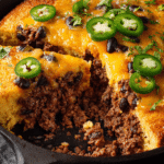 Pour the cornbread batter over the hot beef filling in the skillet, spreading it gently with a spatula to reach the edges. The batter doesn’t need to be perfectly smooth rustic is the vibe here! Thinly slice the remaining jalapeño and sprinkle the slices decoratively over the batter for visual appeal and extra kick.