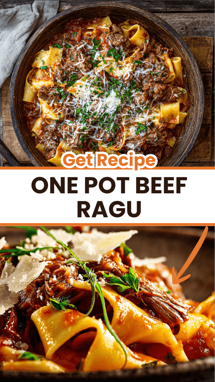 A rich and hearty One Pot Beef Ragu featuring tender chuck beef slow-cooked in a robust tomato sauce with aromatic vegetables, red wine, and Italian herbs. This restaurant-quality dish is perfect served over pappardelle pasta with fresh parmesan cheese.