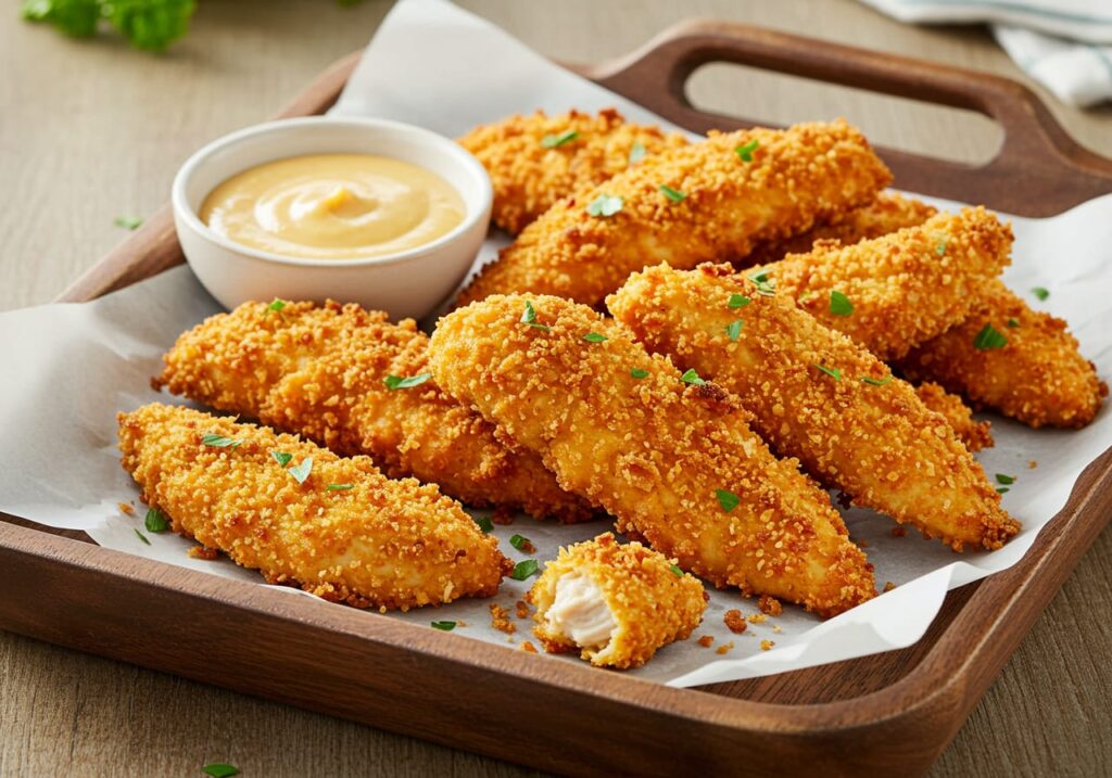 Honey mustard, ranch dressing, BBQ sauce, or a spicy sriracha mayo complement the crunchy tenders perfectly.