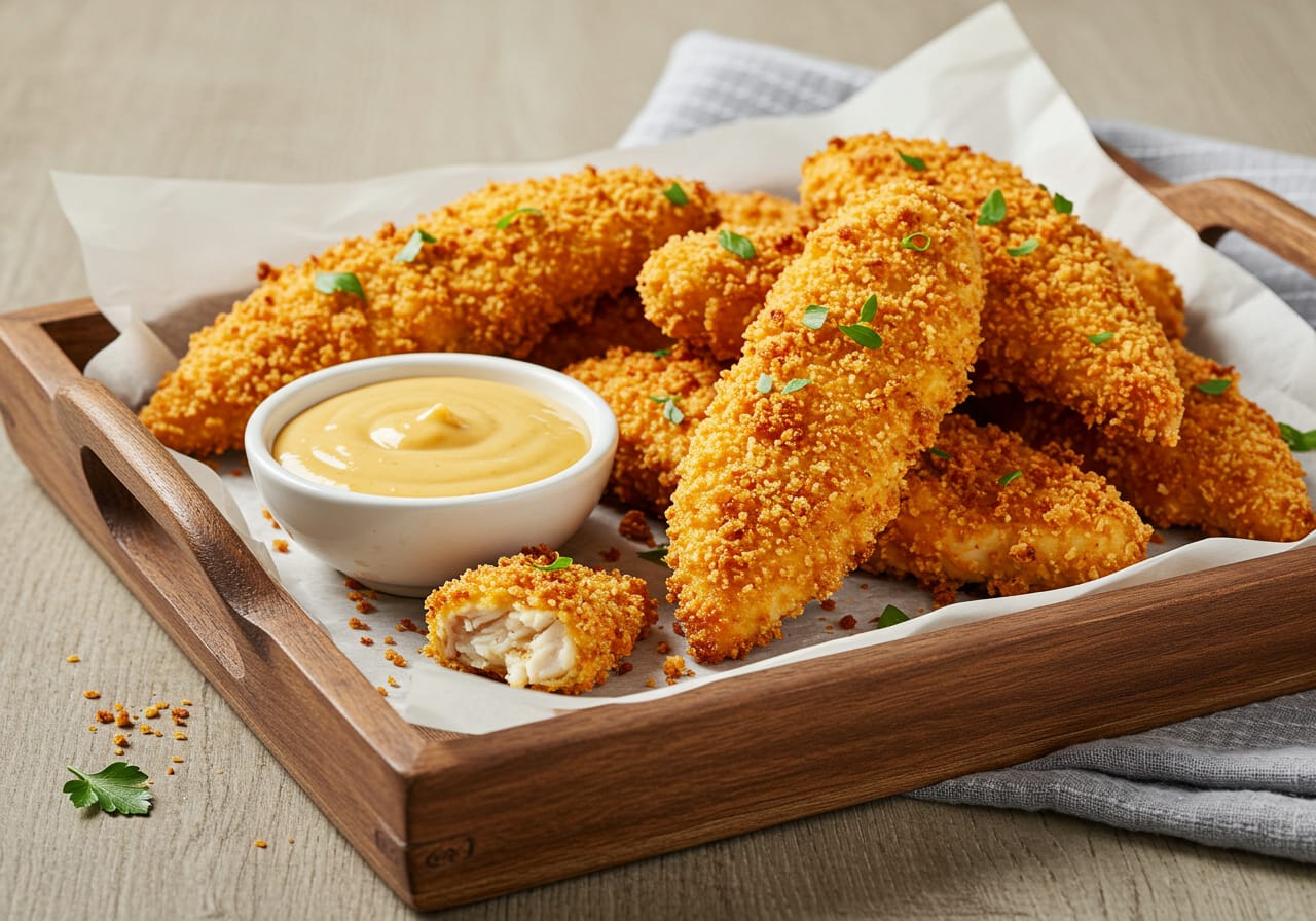 Honey mustard, ranch dressing, BBQ sauce, or a spicy sriracha mayo complement the crunchy tenders perfectly.
