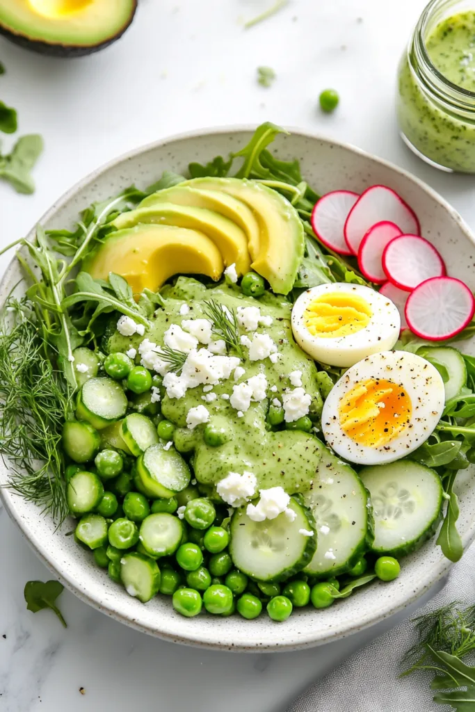 A fresh and vibrant Pea Arugula Salad with green peas, peppery arugula, radishes, cucumbers, avocado, boiled eggs, and crumbled feta, all dressed in a tangy homemade creamy dill dressing. The perfect spring lunch idea ready in under 20 minutes.