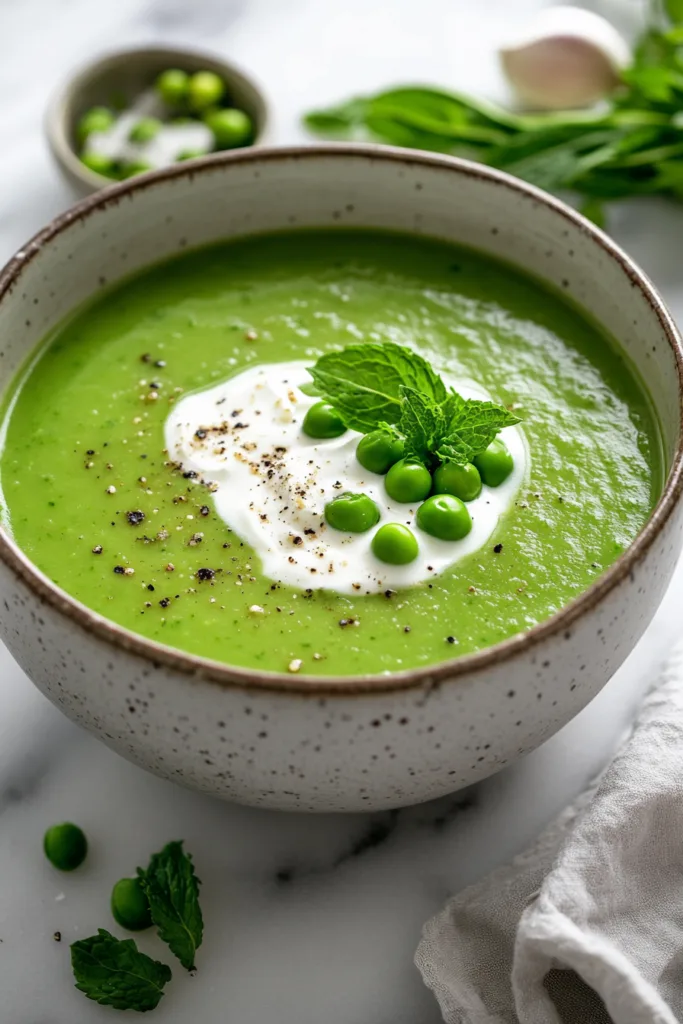 A vibrant and silky Pea and Mint Soup made with fresh spring peas, fragrant mint, and a swirl of buttermilk. Ready in 30 minutes and perfect served hot or cold.