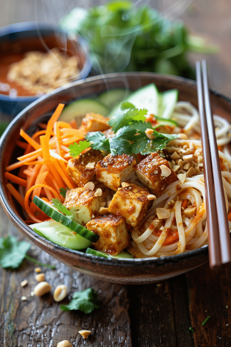 Divide the dressed noodles among four serving bowls. Artfully arrange the cucumber, carrot, and tofu strips on top. Garnish generously with fresh herbs and crushed peanuts. Serve immediately with sriracha on the side, allowing everyone to customize their heat level. For a beautiful presentation, arrange the vegetables in sections rather than mixing everything together.