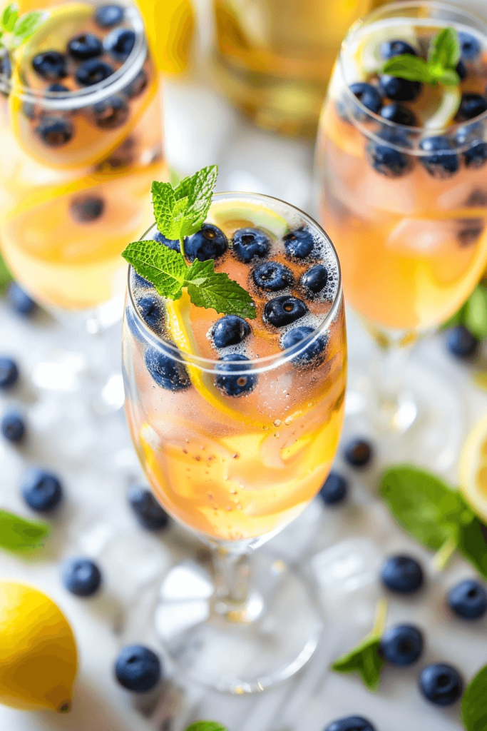 5. Garnish each glass with fresh mint leaves and a thin lemon round on the rim. Serve immediately while bubbly.