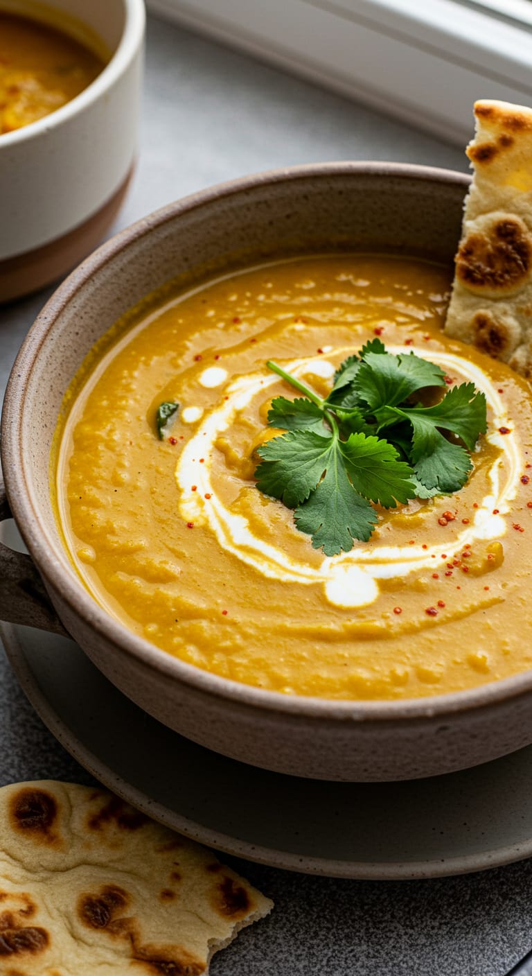 A cozy and nourishing soup made with red lentils, fragrant spices, and fresh vegetables perfect for chilly days.