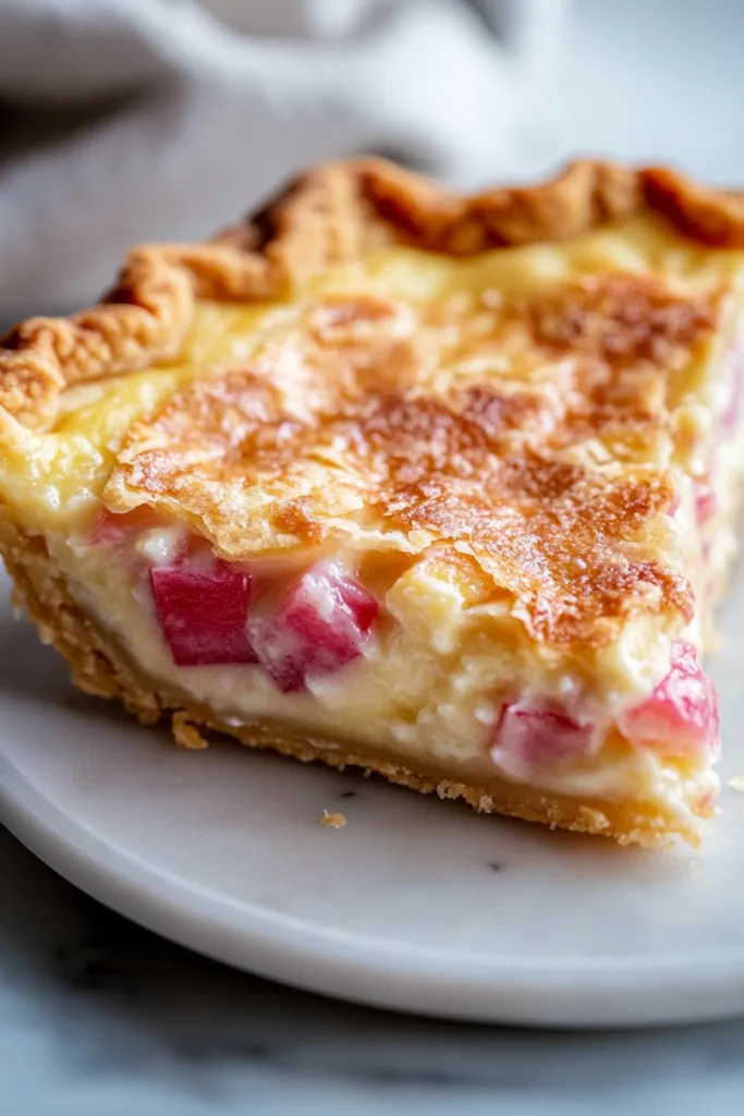 What makes this pie truly special is the contrast of flavors. The natural tartness of fresh rhubarb is perfectly balanced by the sweet, creamy custard made with eggs and heavy whipping cream. Once baked, the filling sets into a luscious, velvety texture that melts in your mouth with every bite. This is the kind of recipe passed down through generations for a reason.