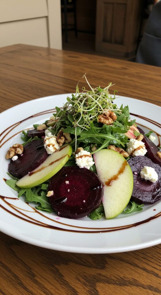 A colorful roasted beet and goat cheese salad with arugula, green apple slices, toasted walnuts, and a balsamic vinaigrette drizzle.