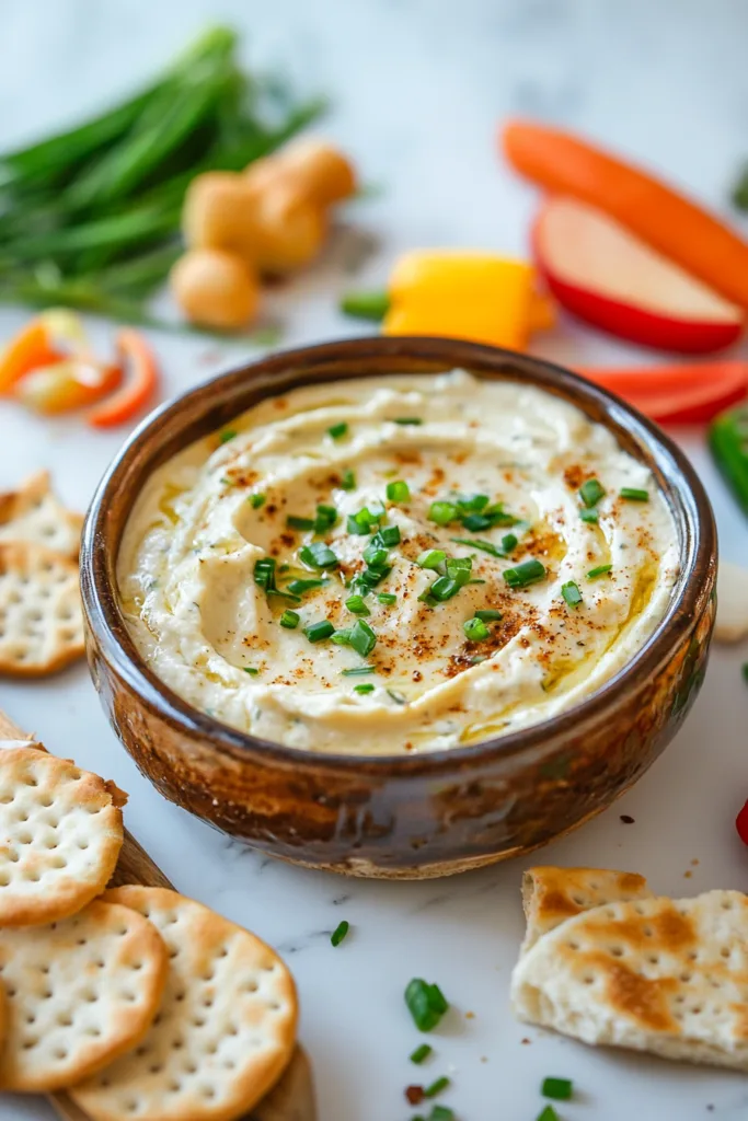 7. To serve, transfer dip to a serving dish and sprinkle with fresh chives. Serve with crackers, toasted baguette slices, potato chips, and/or cut vegetables.