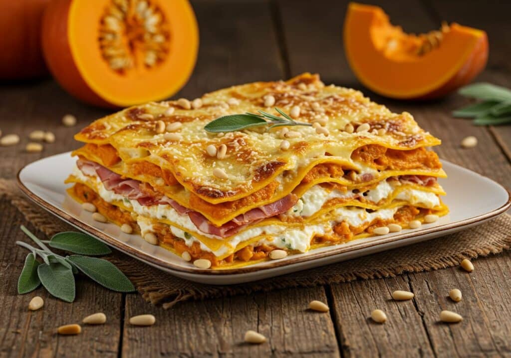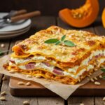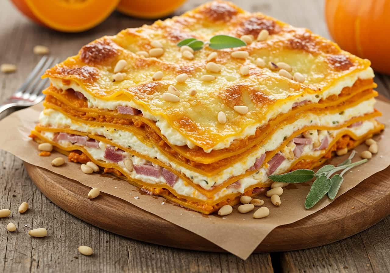 Warm and comforting Roasted Pumpkin Lasagna layered with tender roasted pumpkin, speck ham, creamy béchamel, and toasted pine nuts for an autumn delight.