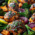 Need Healthy Dinner Ideas that actually work for busy families? This Sheet Pan BBQ Chicken delivers tender, flavorful chicken breasts with roasted sweet potatoes, broccolini, and red onions all in one pan with minimal cleanup. Ready in 40 minutes, it’s perfect for Dinner Ideas For Family featuring just 5 main ingredients plus a simple spice rub.