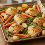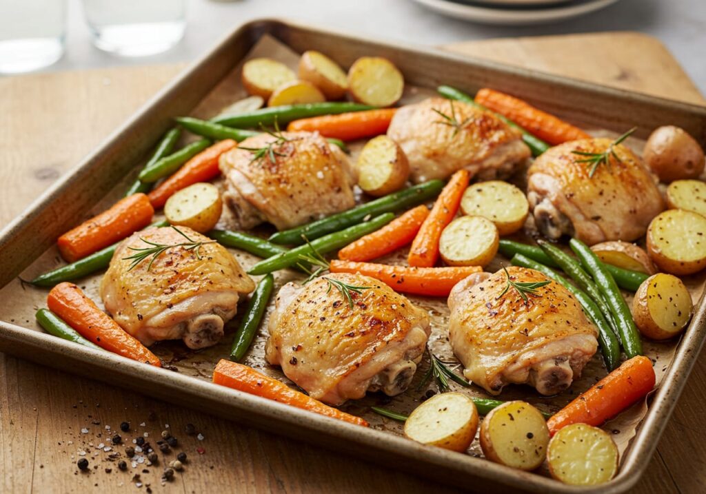 Use bone-in skin-on chicken thighs for best flavor. Toss veggies every 10 minutes for even roasting.