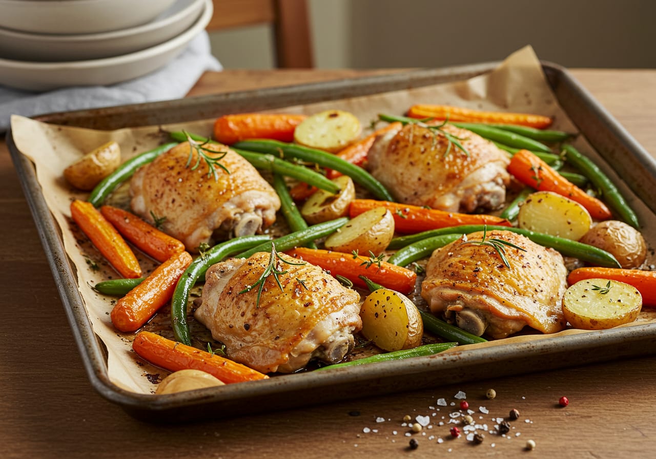 Use bone-in skin-on chicken thighs for best flavor. Toss veggies every 10 minutes for even roasting.