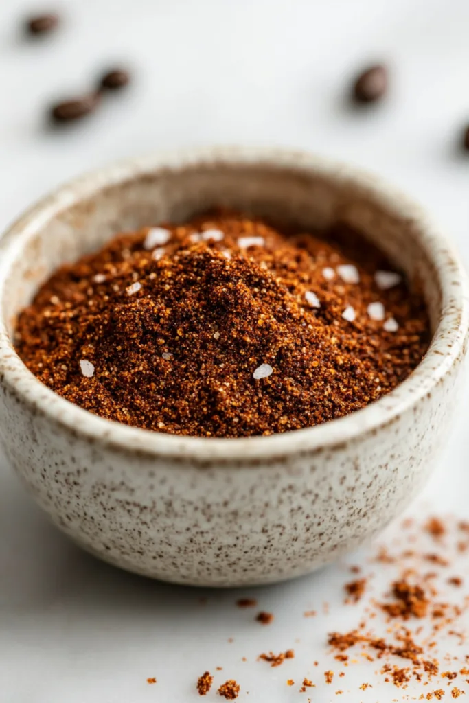 A BBQ coffee spice rub is a dry blend of spices and ground coffee beans used to season and marinate meat, fish, or vegetables before cooking. The coffee adds a deep, smoky, slightly charred flavor without any bitterness, while the additional spices like smoked paprika, garlic, and onion powder provide a savory backbone. This version is Healthy Homemade Smoky BBQ Coffee Spice Rub made with clean, natural ingredients only.