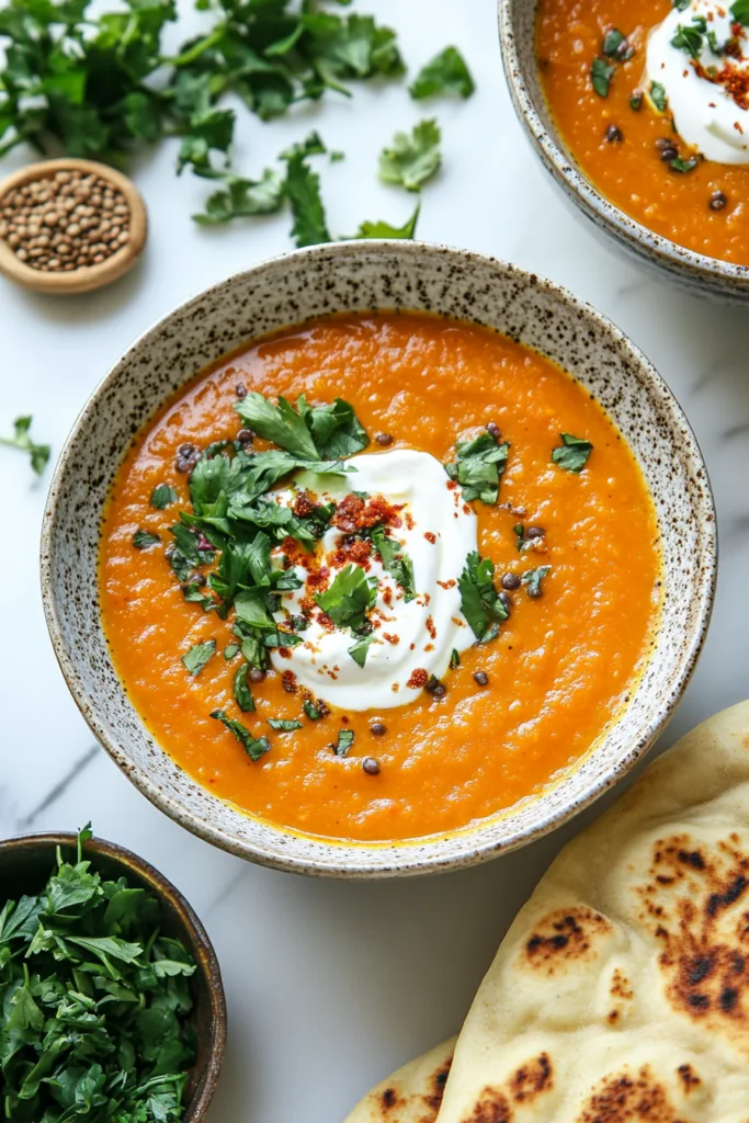 - Season and serve: Taste the soup and adjust salt and pepper as needed. Ladle into bowls and top each serving with a dollop of plain yogurt and a sprinkle of the reserved toasted cumin and chilli flakes. Serve immediately with warmed naan breads.