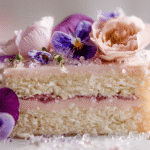 A stunning 3-layer white chocolate cake with luscious strawberry buttercream frosting, garnished with fresh organic edible flowers. This spring showstopper is perfect for garden parties, birthdays, and elegant celebrations.