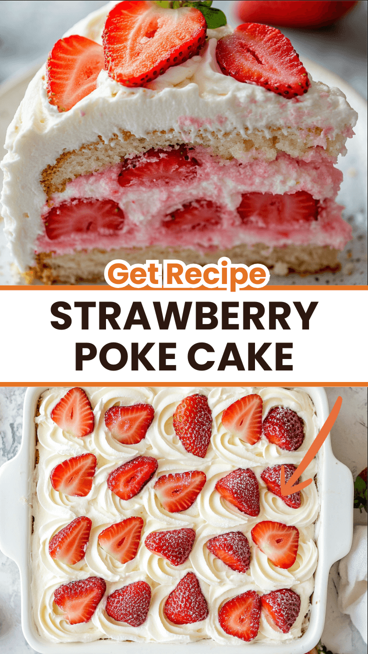 If you are looking for a dessert that is as beautiful as it is delicious, this Strawberry Poke Cake is exactly what you need. Inspired by the charm of a vintage strawberry shortcake, this recipe combines a fluffy white cake soaked with strawberry gelatin and sweetened condensed milk, then topped with a luscious cream cheese whipped frosting and fresh sliced strawberries. It is moist, fruity, and absolutely irresistible – the kind of dessert that disappears within minutes at any gathering.