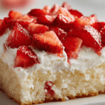 This Strawberry Shortcake Sheet Cake features a moist vanilla cake base made with white cake mix and instant pudding, topped with a fluffy whipped cream cheese layer and fresh diced strawberries. Easy, crowd-pleasing, and perfect for any occasion.