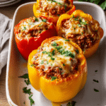 Tender bell peppers stuffed with savory ground beef, fluffy rice, diced tomatoes, and melted Monterey Jack cheese. This classic American comfort food makes a complete, nutritious meal that’s perfect for busy weeknights and family dinners.