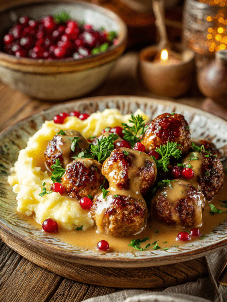 9. Serve meatballs with gravy alongside mashed potatoes and lingonberries.