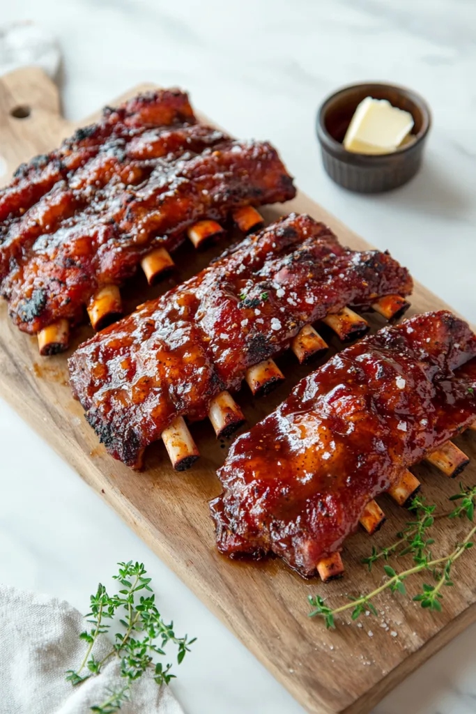 Once your ribs hit that 190°F–203°F range, remove them from the grill and let them rest for 10 minutes on your cutting board. Resting allows the juices to redistribute throughout the meat skipping this step means losing all that flavor to the board. After resting, use your chef’s knife to slice cleanly between each bone. Drizzle or brush the seasoned butter generously over the sliced ribs and serve immediately.