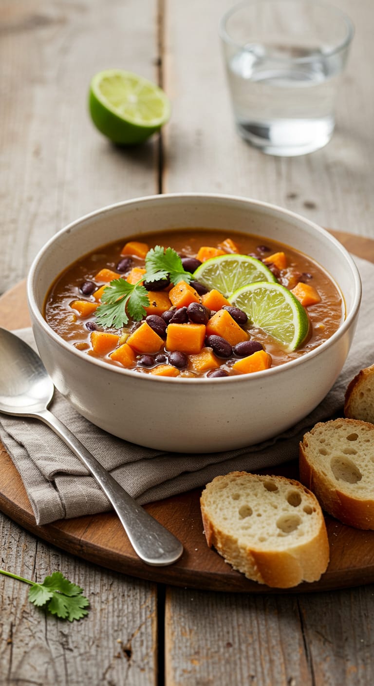 A hearty and healthy Sweet Potato and Black Bean Soup with smoky spices, fresh lime, and wholesome plant-based goodness.