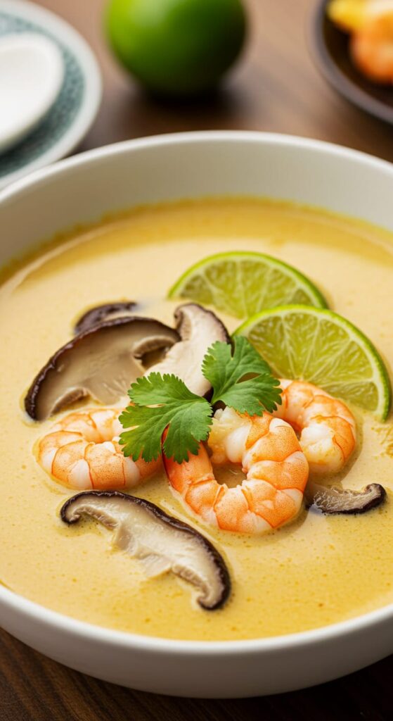 A creamy, aromatic Thai coconut soup made with shrimp, mushrooms, lemongrass, and curry paste for a comforting, flavorful dish.