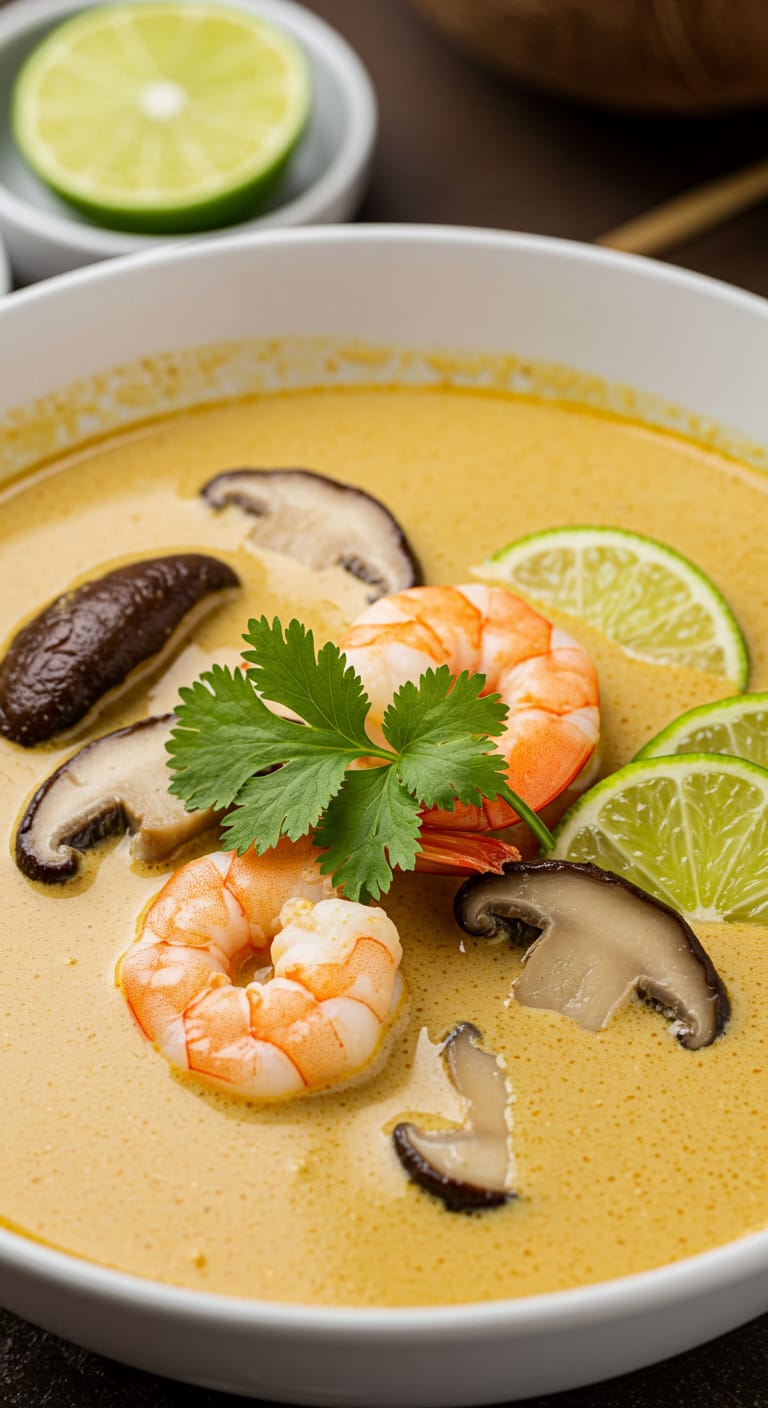A creamy, aromatic Thai coconut soup made with shrimp, mushrooms, lemongrass, and curry paste for a comforting, flavorful dish.