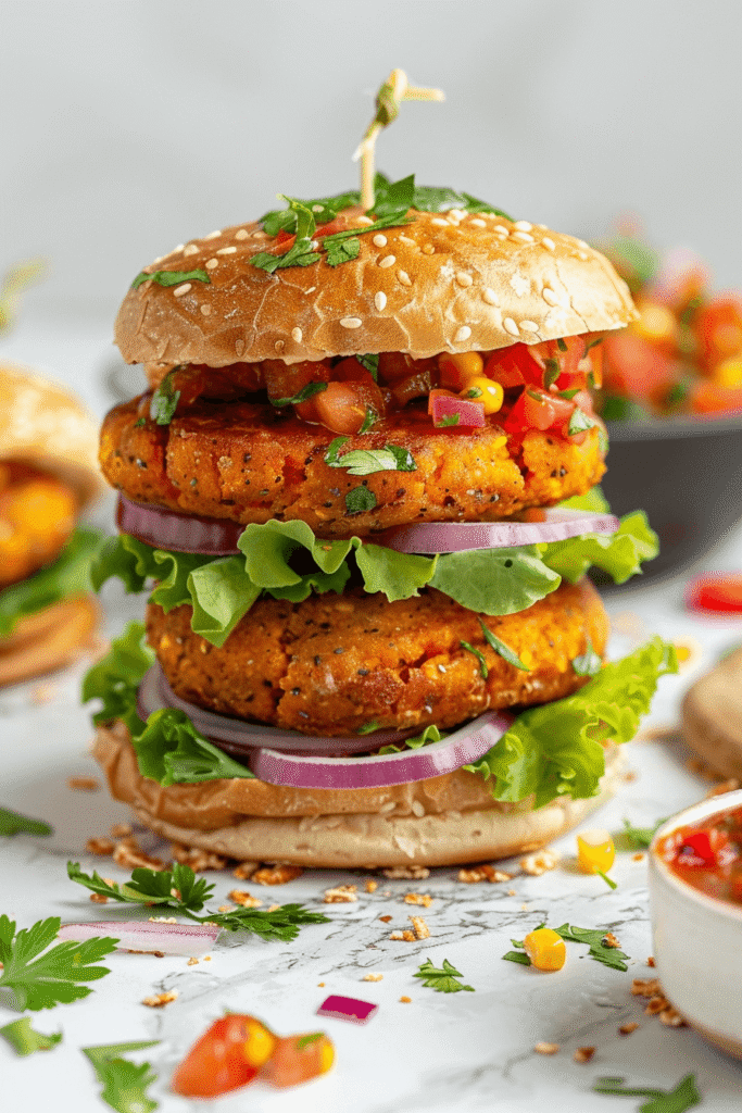 Place each patty into a vegan bun. Top with a generous spoonful of salsa, sliced red onion, and fresh salad leaves. Serve immediately while hot and crispy.