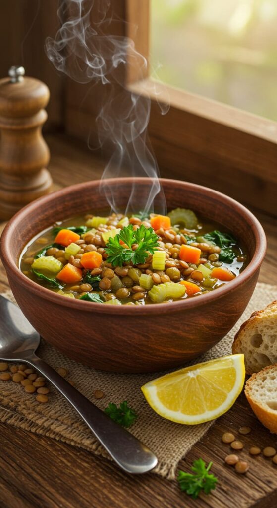 Hearty vegan lentil soup packed with protein-rich lentils, fresh vegetables, and warming spices—a perfect plant-based comfort food.