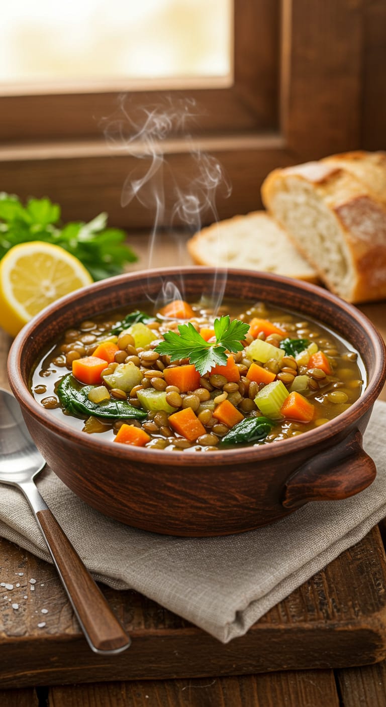 Hearty vegan lentil soup packed with protein-rich lentils, fresh vegetables, and warming spices—a perfect plant-based comfort food.