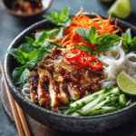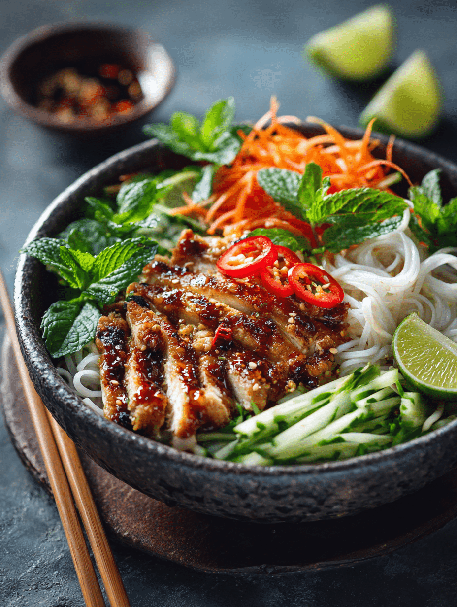 Vietnamese Noodles with Lemongrass Chicken: tender marinated chicken, fresh veggies, and zesty sauce in a vibrant noodle bowl.